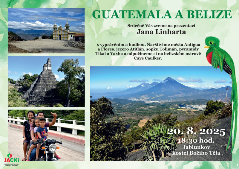 Srdečně vás zveme na prezentaci Jana Linharta - Guatemala a Belize s vyprávěním a hudbou. Navštívíme města Antigua a Flores, jezero Atitlán, sopku Tolimán, pyramidy Tikal a Yaxha a odpočineme si na belizském ostrově Caye Caulker.
