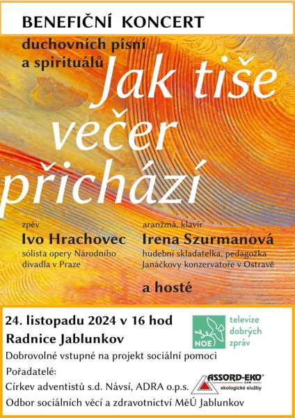V neděli 24. listopadu 2024 se prostory radnice v Jablunkově na chvíli stanou koncertním sálem. V 16 hodin se zde uskuteční benefiční koncert duchovních písní, spirituálů a mluveného slova složeného z básní Františka Novotného. Vystoupí sólista opery Národního divadla v Praze Ivo Hrachovec za klavírního doprovodu hudební skladatelky a pedagožky Janáčkovy konzervatoře v Ostravě Ireny Szurmanové a hostů. Součástí programu budou i tématické obrazy výtvarnice Jany Hrachovcové.